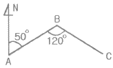 측선 AB의 방위가 N 50°E일 때 측선 BC의 방위는? (단, ∠ABC=120°이다.)