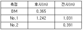 BM에서 출발하여 NO.2까지 수준측량한 야장이 다음과 같다. BM와 NO.2의 고저차는?