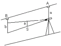 경사진 터널 내에서 2점간의 표고차를 구하기 위하여 측량한 결과 아래와 같은 결과를 얻었다. AB의 고저차 크기는? (단, a=1.20m, b=1.65m, α=-11°, S=35m)