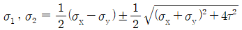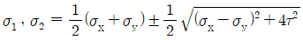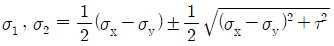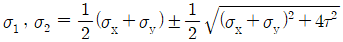 다음 그림과 같은 평면응력상태에서 주응력 σ1와 σ2를 구하는 식으로 옳은 것은?