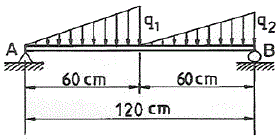 그림과 같은 분포하중을 받는 양단지지보의 반력 RA, RB의 값은 각각 몇 N인가? (단, q1=10N/cm, q2=8N/cm이다.)