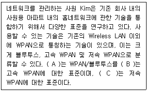 다음은 Home Network에 사용되는 기술 중 WPAN(Wireless Personal Area Network)에 대한 설명이다. (A), (B), (C) 안에 들어갈 표준을 순서대로 나열한 것은 무엇인가?