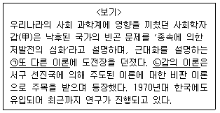 <보기>의 근대화를 설명하는 이론 중 밑줄 친 ㉠, ㉡에 대한 설명으로 가장 옳지 않은 것은?