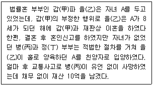병(丙)의 사망으로 법정 상속 순위에 따라 정(丁)이 단독 상속하게 된다.