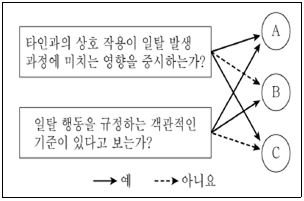 <보기>는 일탈 행위 A~C를 질문에 따라 구분한 것이다. 이에 대한 설명으로 가장 옳은 것은? (단, A~C는 각각 낙인 이론, 아노미 이론, 차별 교제 이론 중 하나이다.)