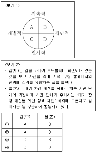<보기 1>의 사회 참여 유형 A~D에서 <보기 2>의 갑(甲)과 을(乙)의 행위에 해당하는 사회 참여 유형을 옳게 짝지은 것은?