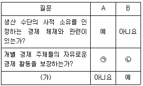 <보기>는 경제 체제 A와 B를 구분한 것이다. 이에 대한 설명으로 가장 옳은 것은? (단, A와 B는 각각 시장 경제 체제와 계획 경제 체제 중 하나이다.)