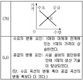 <보기>의 ㈎는 X재 시장의 상황을 나타낸다. <보기> ㈏의 수요와 공급의 변동 요인을 통해 추론할 수 있는 X재 시장의 균형 가격과 균형 거래량의 변화로 가장 옳은 것은? (단, X재와 Y재는 모두 수요법칙과 공급법칙을 따른다.)