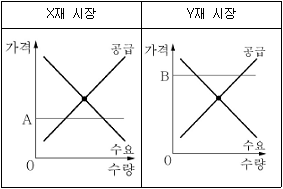 정부가 각각 A와 B로 가격을 정한 X재 시장과 Y재 시장에 대한 설명으로 가장 옳은 것은?