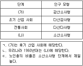 <보기 1>은 전통 사회에서 고도 산업 사회까지의 인구 변천 단계를 순서 없이 나타낸 것이다. 이에 대한 옳은 분석을 <보기 2>에서 모두 고른 것은?