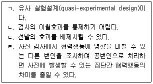 한 학기 동안 교실에서의 협력행동 증진 프로그램 효과를 검증하기 위해서 5학년 1반은 실험집단, 5학년 2반은 통제집단으로 선정하고 학기 시작과 종료 시 협력행동 척도로 측정하였다. 연구 설계에 관한 설명으로 옳은 것을 모두 고른 것은?