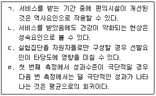 노인복지센터에서 1년간 제공한 건강증진서비스의 효과를 검증하는 실험연구를 실시하였다. 내적 타당도 저해 요인에 관한 설명으로 옳은 것을 모두 고른 것은?