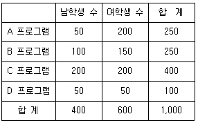 다음 표는 남학생과 여학생 간의 선호하는 상담프로그램의 차이를 보여주는 자료이다. A 프로그램을 선호하는 여학생의 기대빈도수는?