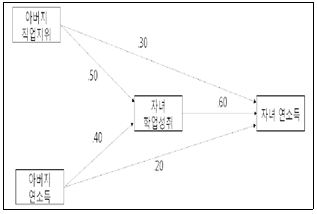 다음은 아버지의 직업지위와 연소득이 자녀의 연소득에 미치는 영향에 대한 경로계수추정 결과이다. 자녀의 연소득에 대한 아버지 직업지위의 총효과(ㄱ)와 아버지 연소득이 자녀의 학업성취를 거쳐 자녀의 연소득에 영향을 미치는 간접효과(ㄴ)는?