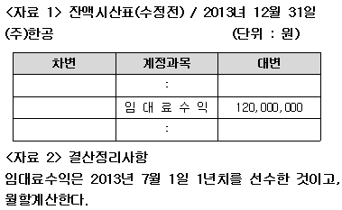 다음은 (주)한공의 2013년 12월 31일 수정전 잔액시산표의 일부와 결산정리사항을 나타낸 것이다. 결산정리사항을 반영한 후, 2013년 12월 31일 재무상태표상 선수임대료는 얼마인가?