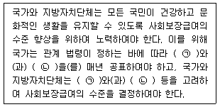 「사회보장기본법」에 따른 사회보장급여의 수준에 대한 설명으로 ㉠, ㉡에 들어갈 용어를 바르게 연결한 것은? (순서대로 ㉠, ㉡)