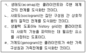 사회복지사가 활용하는 사정도구에 대한 설명으로 옳은 것만을 모두 고르면?