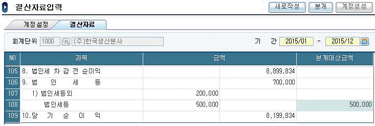 ㈜한국생산은 당기 법인세로 700,000원을 예상하여 결산자료 입력 메뉴에 다음 화면과 같이 입력하였다. (원천징수세액 200,000은 (차) 법인세등 200,000원 (대) 선납세금 200,000원으로 회계처리 되어 있다) 결산 프로세스를 완료하고 상단의 ‘분개’ 프로세스를 실행하였을 때 법인세와 관련하여 자동으로 발행되는 결산전표는 무엇인가?
