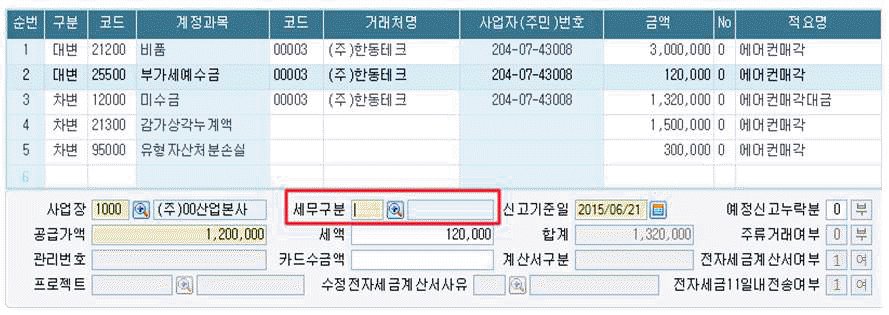 ㈜OO산업은 관리부에서 사용 중이던 에어컨을 매각하고 전자세금계산서를 발급하였다. 다음 화면은 본 거래를 핵심ERP에 입력한 것인데 ‘세무구분’란에 입력될 항목으로 가장 적합한 것은 ?