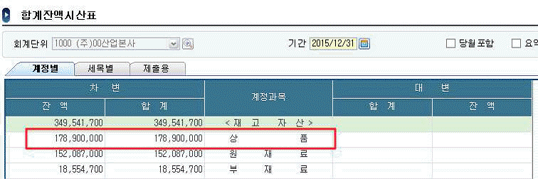 다음 화면은 핵심ERP 합계잔액시산표의 일부분이다. 표시된 부분에 반영될 거래로 가장 적합하지 않은 것은 다음 중 무엇인가?