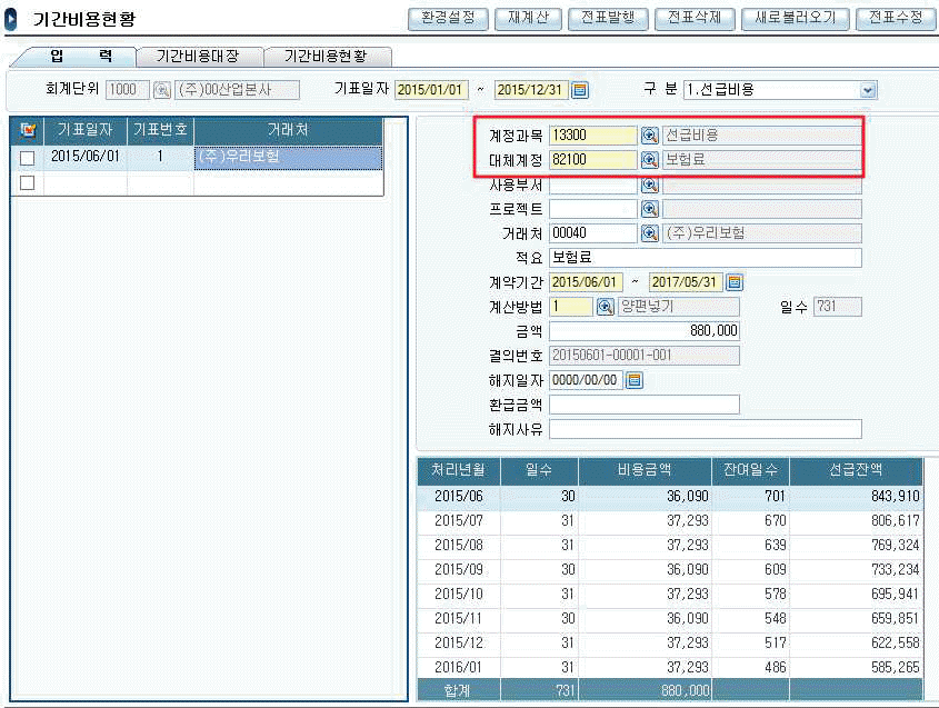 다음은 ㈜OO산업이 6월 1일에 납입한 보험료에 대한 기간비용현황이다. 2015년말 결산 수행시 상단의 전표발행 프로세스를 수행하여 결산전표를 발행하는 경우, 2015년 12월 31일 본 건과 관련한 재무상태표의 선급비용 잔액은 얼마인가? (단, 보험료 지급시 선급비용으로 회계처리 하였다.)