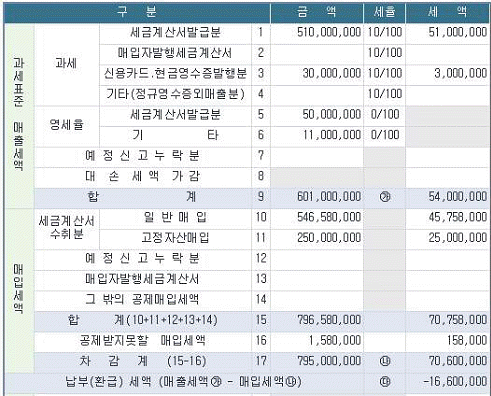 다음 화면은 2016년 2기 예정 부가가치세신고서의 일부이다. 신고서 내용의 설명으로 옳지 않은 것은 무엇인가?