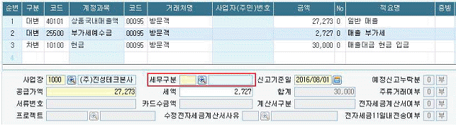 회사 방문객에게 부가가치세가 과세되는 상품을 판매한 후 대금은 현금으로 수취하면서 세금계산서와 현금영수증을 발급하지 않았다. 화면은 핵심ERP에서 이에 대한 회계처리 내역이며, 세무구분에 입력될 항목으로 옳은 것은 무엇인가?