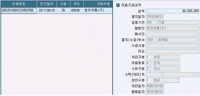 다음 화면은 받을어음명세서를 조회한 것이다. 회사는 자금부족으로 본 어음을 2016년 9월 1일 한아은행을 통해 할인하였다. 할인율이 8%인 경우 매출채권처분손실액을 계산하면 얼마인가? (단, 할인료는 월할계산)