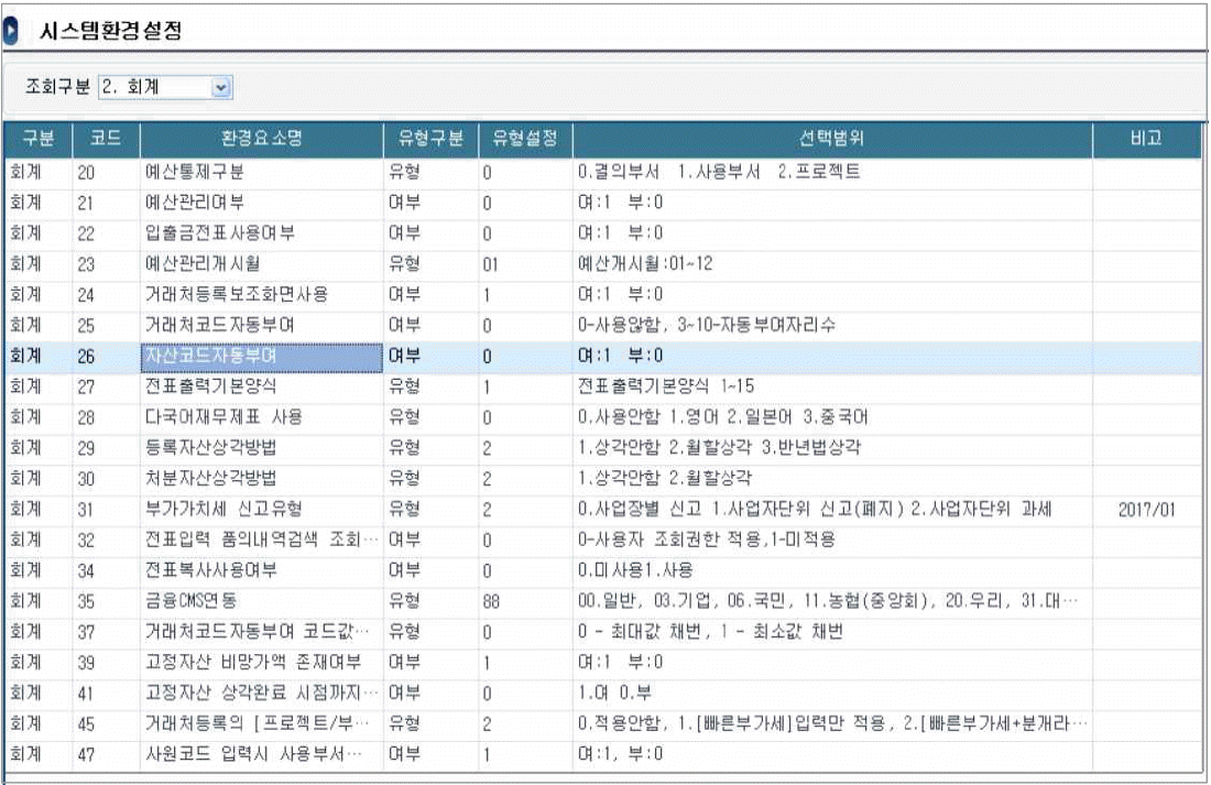 다음은 핵심ERP 회계모듈 사용에 필요한 시스템환경설정 메뉴 화면이다. 다음 설명 중 가장 옳지 않은 것은?