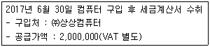 2017년 6월 30일에 ㈜상상컴퓨터에서 컴퓨터를 구입 후 신안은행 보통예금계좌로 이체하였다. [보기]를 보고 전표입력을 실행 후 2017년 1기 확정신고 기간에 취득한 자산의 총 매입금액은 얼마인가? (본 문제는 시뮬레이션 문제로서 [실기메뉴]의 메뉴를 활용하여 문제에 답하시오.)