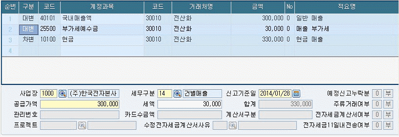 ㈜한국전자는 개인에게 상품 330,000원(공급대가)을 판매하고 현금영수증을 발급하였다. 다음 입력화면에 대한 설명 중 옳은 것은 무엇인가?