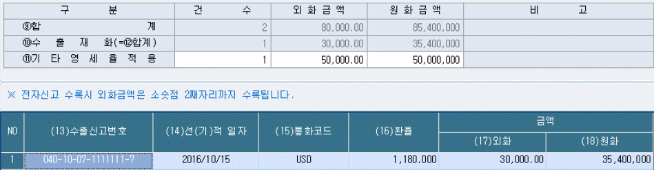다음 화면은 핵심ERP 수출실적명세서 화면의 일부이다. 화면에 대한 설명으로 옳지 않은 것은?