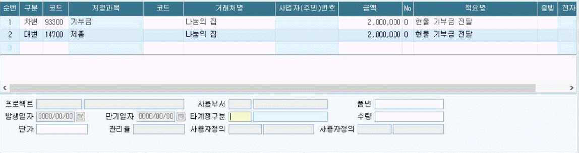 당사는 ‘나눔의 집’이라는 복지단체에 판매용 제품 1,000,000원을 기부하였다. 다음 화면에 표시된 ‘타계정구분’란에 입력될 내용으로 옳은 것은?