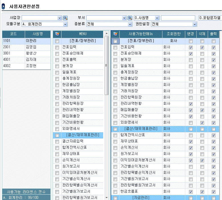 다음 중 이관리 사원의 사용자권한설정 내용에 대한 설명으로 가장 적합하지 않은 것은 무엇인가?