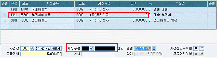 다음 전표입력화면의 부가세예수금계정 금액란에 0원으로 입력되는 세무구분이 아닌 것은 무엇인가?