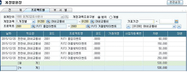㈜OO회사는 다음 화면과 같이 여비교통비에 대해 프로젝트별로 집계하고자 한다. 이를 위한 업무프로세스의 설명으로 적절하지 않은 것은 무엇인가?