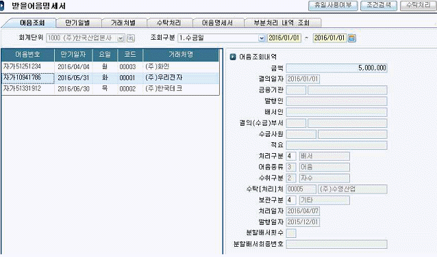 다음의 받을어음명세 화면을 보고 거래내역을 추정한 것으로 가장 옳은 것은?