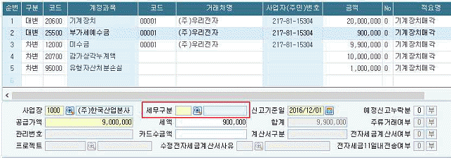 ㈜한국산업은 기계장치를 매각하고 전자세금계산서를 발급하였다. 다음 화면의 세무구분에 입력될 항목으로 옳은 것은?