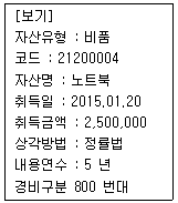 다음 [보기]의 자산 내용을 참고하여 고정자산 취득내역을 등록하고 감가상각비를 계산하면 얼마인가? * 본 문제는 시뮬레이션 문제로서 [실기메뉴]의 메뉴를 활용하여 문제에 답하시오.