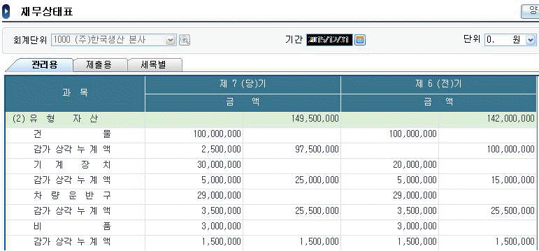 다음 화면은 ㈜한국생산의 재무상태표 중 일부이다. 기중 거래 내역 중 자본적지출로 처리하여야 할 건물수선비 5,000,000원을 수선비로 잘못 처리하였다. 수정 회계처리 후 건물 장부금액은 얼마인가 ?