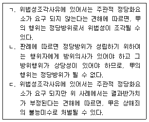 1 「형법」제263조(동시범)에 대한 설명으로 옳지 않은 것은? (다툼이 있는 경우 판례에 의함) 2 위법성조각사유에 대한 설명으로 옳지 않은 것은? (다툼이 있는 경우 판례에 의함) 3 다음 설명 중 옳지 않은 것은? (다툼이 있는 경우 판례에 의함) 4 형법의 시간적 적용범위에 대한 설명으로 옳지 않은 것은? (다툼이 있는 경우 판례에 의함) 5 다음 설명 중 옳지 않은 것은? (다툼이 있는 경우 판례에 의함) 6 기대가능성에 대한 설명으로 옳은 것(O)과 옳지 않은 것(X)을 바르게 표시한 것은? (다툼이 있는 경우 판례에 의함) (순서대로 ㄱ, ㄴ, ㄷ, ㄹ) 7 甲은 평소 미워하던 乙과 우연히 마주치자 상해의 의사로 乙의 얼굴을 주먹으로 강타하여 코피가 나게 하였는데, 마침 그때 乙은 甲을 살해하려고 칼로 甲을 공격하려던 순간이었음이 밝혀졌다. 이에 대한 설명으로 옳은 것만을 모두 고르면? 8 다음 설명 중 옳은 것은? (다툼이 있는 경우 판례에 의함) 9 甲은 乙의 애인 A를 자신의 애인 B로 오인하여 놀라게 할 생각으로 뒤에서 그녀의 어깨를 껴안았는데, 乙은 甲을 성폭행범으로 오인하고 甲을 주먹으로 때려 전치 4주의 타박상을 입혔다. 이에 대한 설명으로 옳은 것은? (다툼이 있는 경우 판례에 의함) 10 상해에 대한설명으로옳지 않은 것은? (다툼이 있는경우 판례에 의함) 11 친족상도례에 대한 설명으로 옳지 않은 것은? (다툼이 있는 경우 판례에 의함) 12 다음 사례 중 甲에게 중과실이 인정되는 것만을 모두 고르면? (다툼이 있는 경우 판례에 의함)