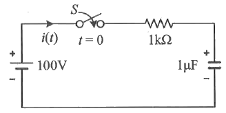 t=0에서 스위치(S)를 닫았을 때 t=0+에서의 i(t)는 몇 A 인가? (단, 커패시터에 초기 전하는 없다.)