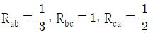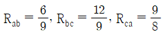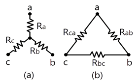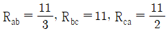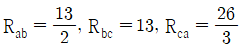 그림 (a)의 Y결선 회로를 그림 (b)의 △결선회로로 등가 변환했을 때 Rab, Rbc, Rca는 각각 몇 Ω 인가? (단, Ra = 2Ω, Rb = 3Ω, Rc = 4Ω)