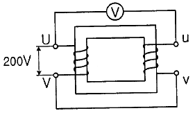 210/105V의 변압기를 그림과 같이 결선하고 고압측에 200V의 전압을 가하면 전압계의 지시는 몇 V 인가? (단, 변압기는 가극성이다.)
