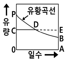 다음과 같은 유황곡선을 가진 수력지점에서 최대사용 수량 0C로 1년간 계속 발전하는데 필요한 저수지의 용량은?