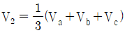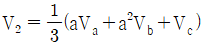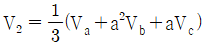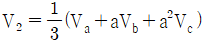 상순이 a-b-c인 회로에서 3상 전압이 Va(V), Vb(V), Vc(V)일 때 역상분 전압 V2(V)는?