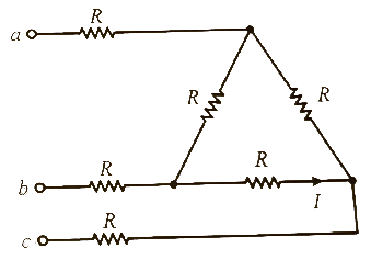 그림과 같이 결선된 회로의 단자(a, b, c)에 선간전압이 V(V)인 평형 3상 전압을 인가할 때 상전류 I(A)의 크기는?