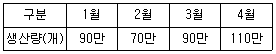 야구공을 생산하는 회사의 다음 자료를 이용하여 최근 4개월 자료로 가중이동평균법을 적용할 때, 5월의 예측생산량은? (단, 가중치는 0.5, 0.3, 0.2를 적용한다.)