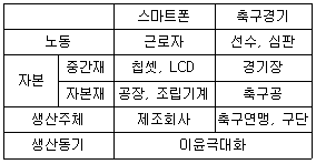 다음 휴대폰과 축구경기를 생산하는 과정을 비교하는 표에서 틀리게 분류한 것은?