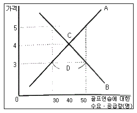 골프연습장의 수요와 공급곡선이 다음과 같을 때의 설명으로 틀린 것은? (단, 가격의 단위는 천원이다.)